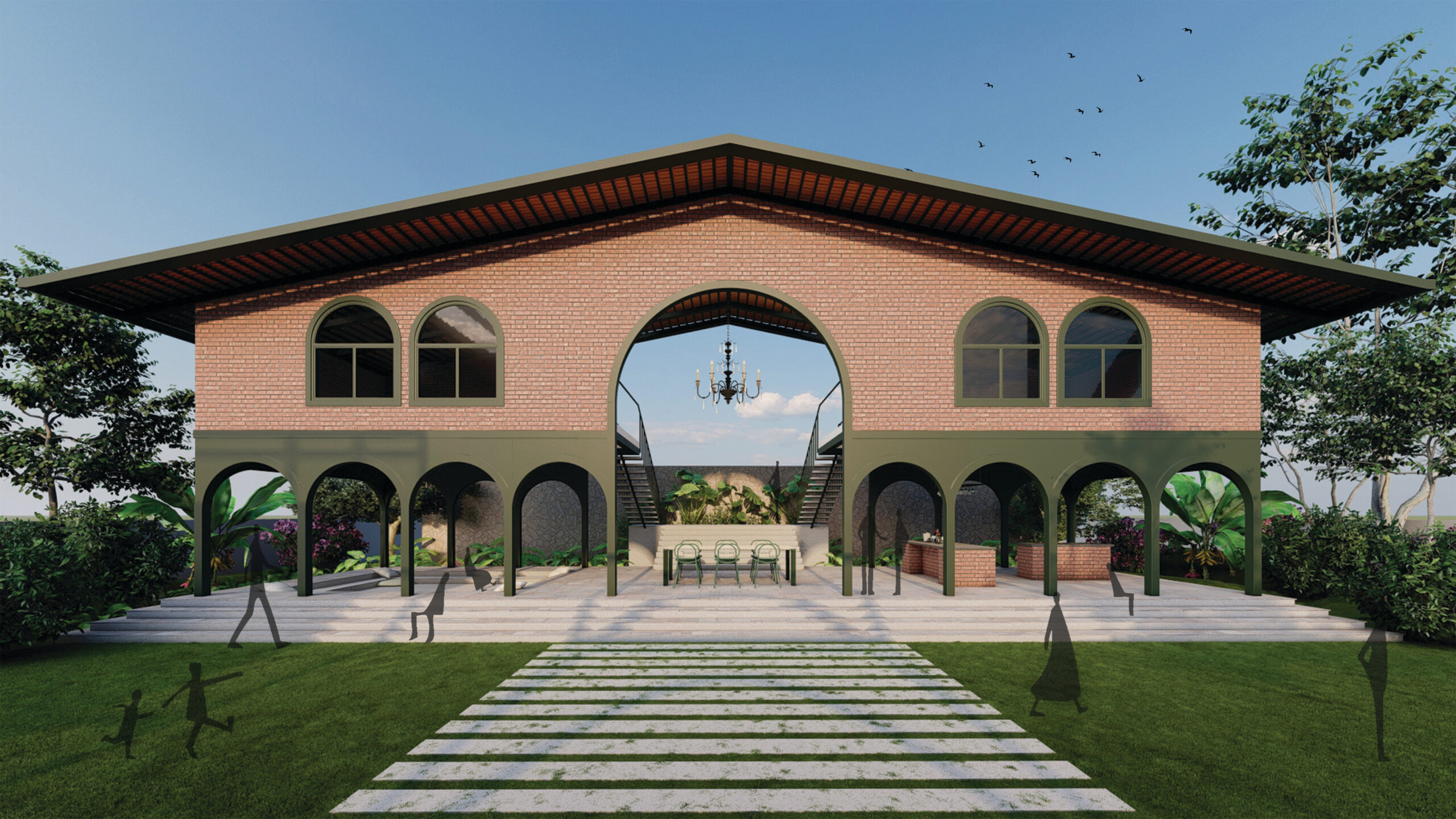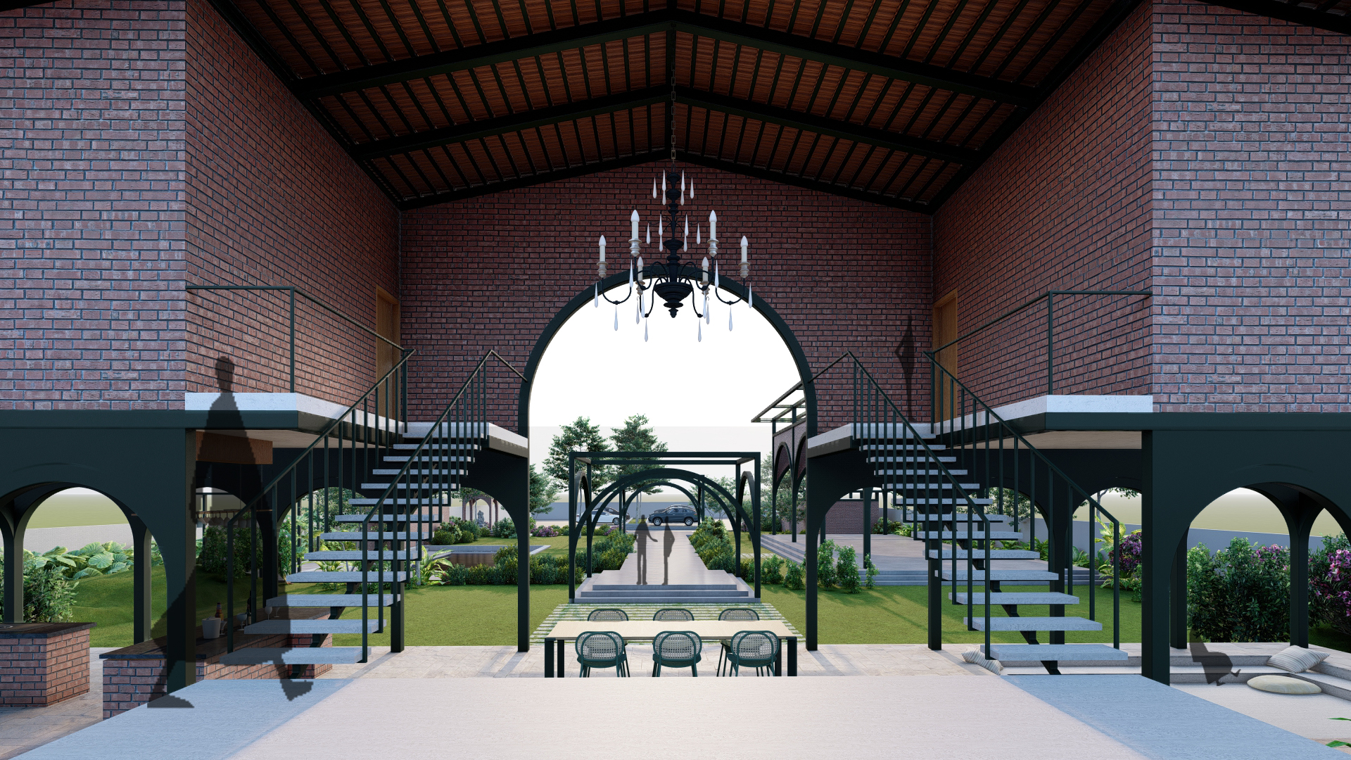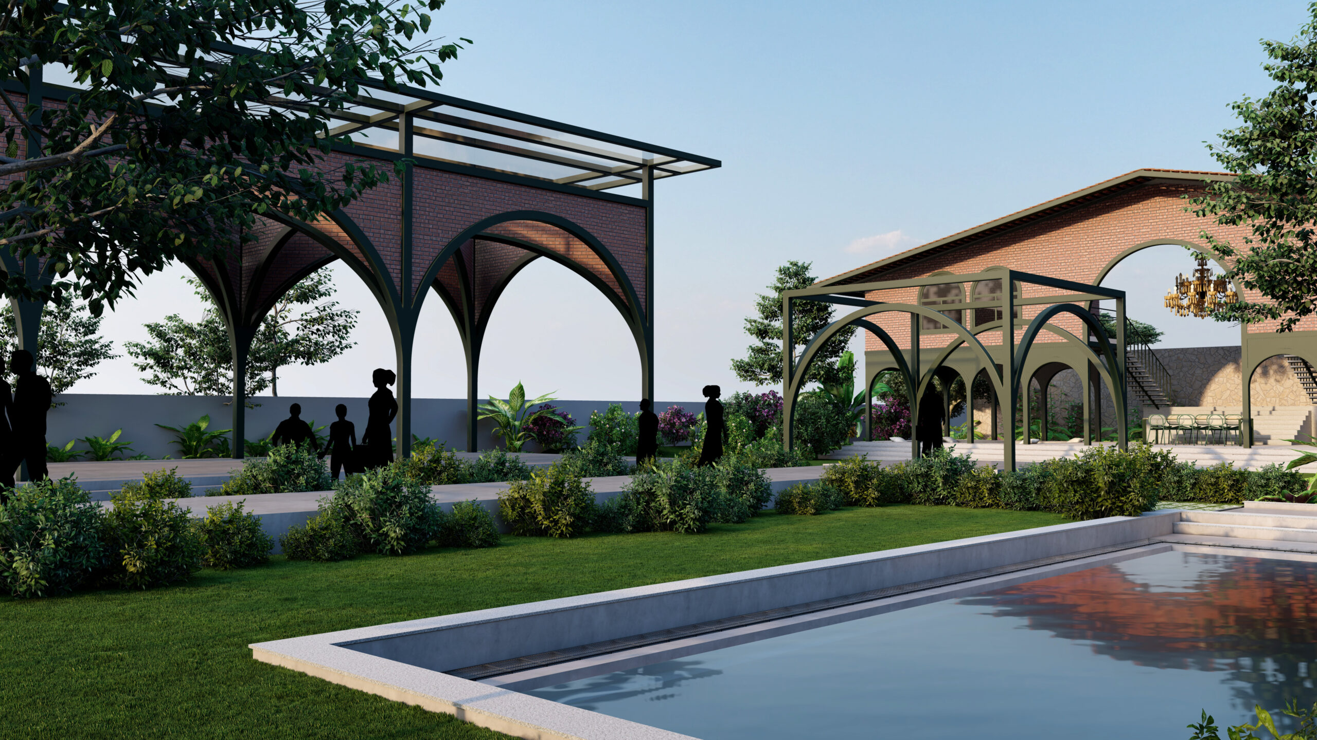 From the parking zone, an arched entrance plaza leads toward the farmhouse at the far end, with a small shrine positioned to the northeast of the entry. The site unfolds into three distinct event settings—the pavilion, outdoor pool, and farmhouse—each offering a unique spatial experience and striking visual backdrop. The pavilion’s intersecting arches and transparent roof create a dramatic focal point, while the adjacent pool introduces a serene counterbalance. The central axis culminates at the farmhouse, defined by soaring 7.5-metre arches and a sweeping tiled roof
