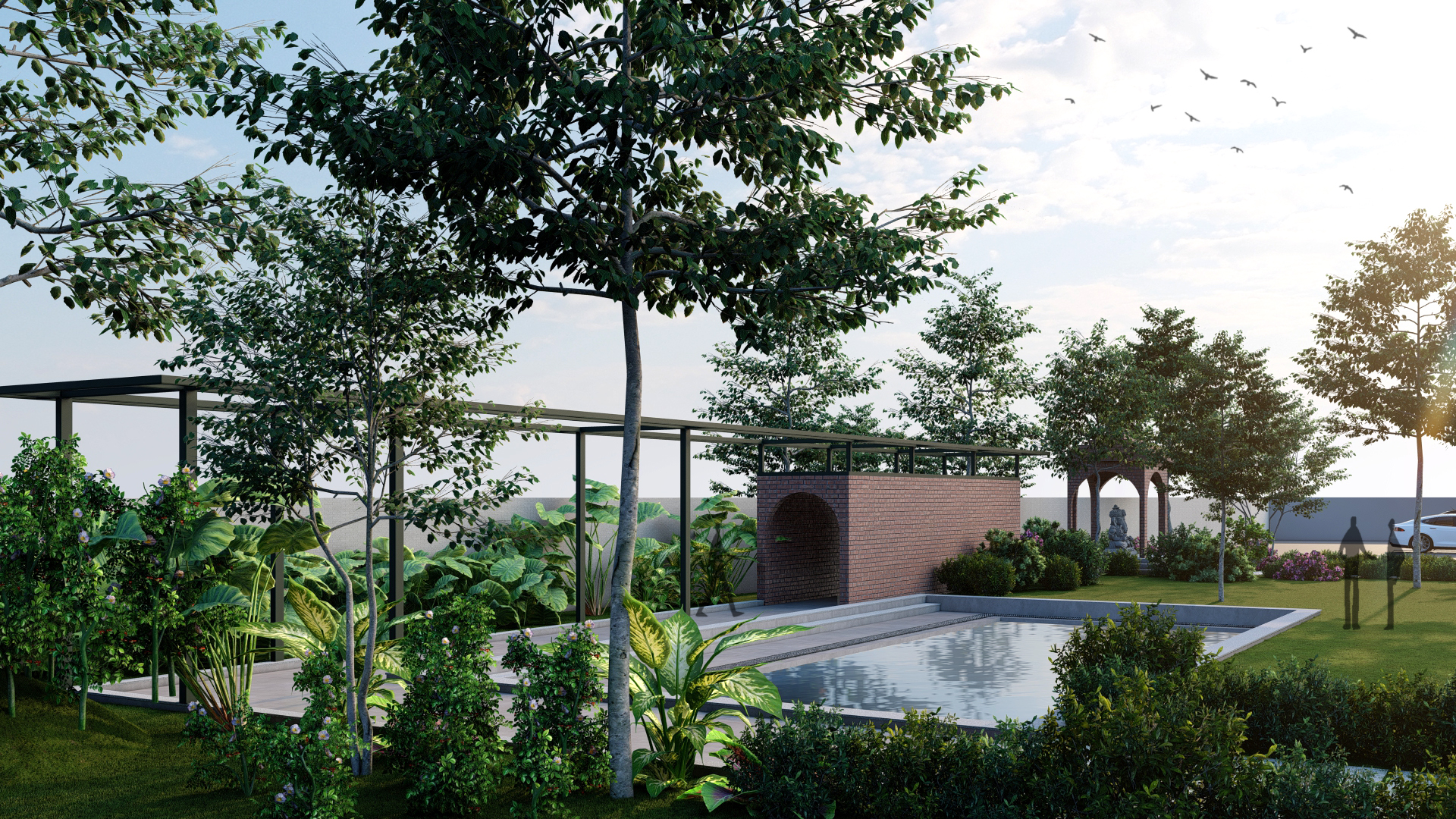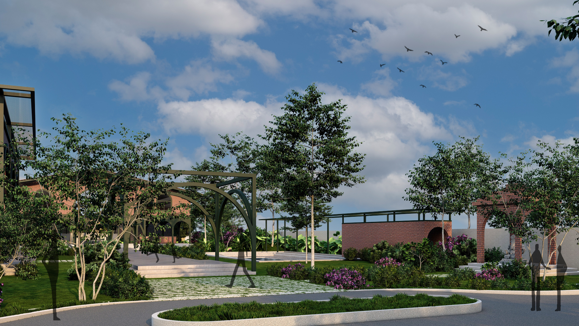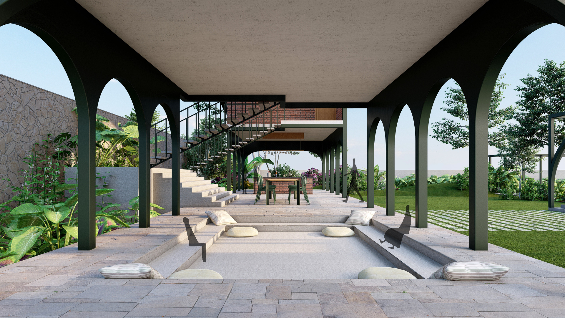 From the parking zone, an arched entrance plaza leads toward the farmhouse at the far end, with a small shrine positioned to the northeast of the entry. The site unfolds into three distinct event settings—the pavilion, outdoor pool, and farmhouse—each offering a unique spatial experience and striking visual backdrop. The pavilion’s intersecting arches and transparent roof create a dramatic focal point, while the adjacent pool introduces a serene counterbalance. The central axis culminates at the farmhouse, defined by soaring 7.5-metre arches and a sweeping tiled roof