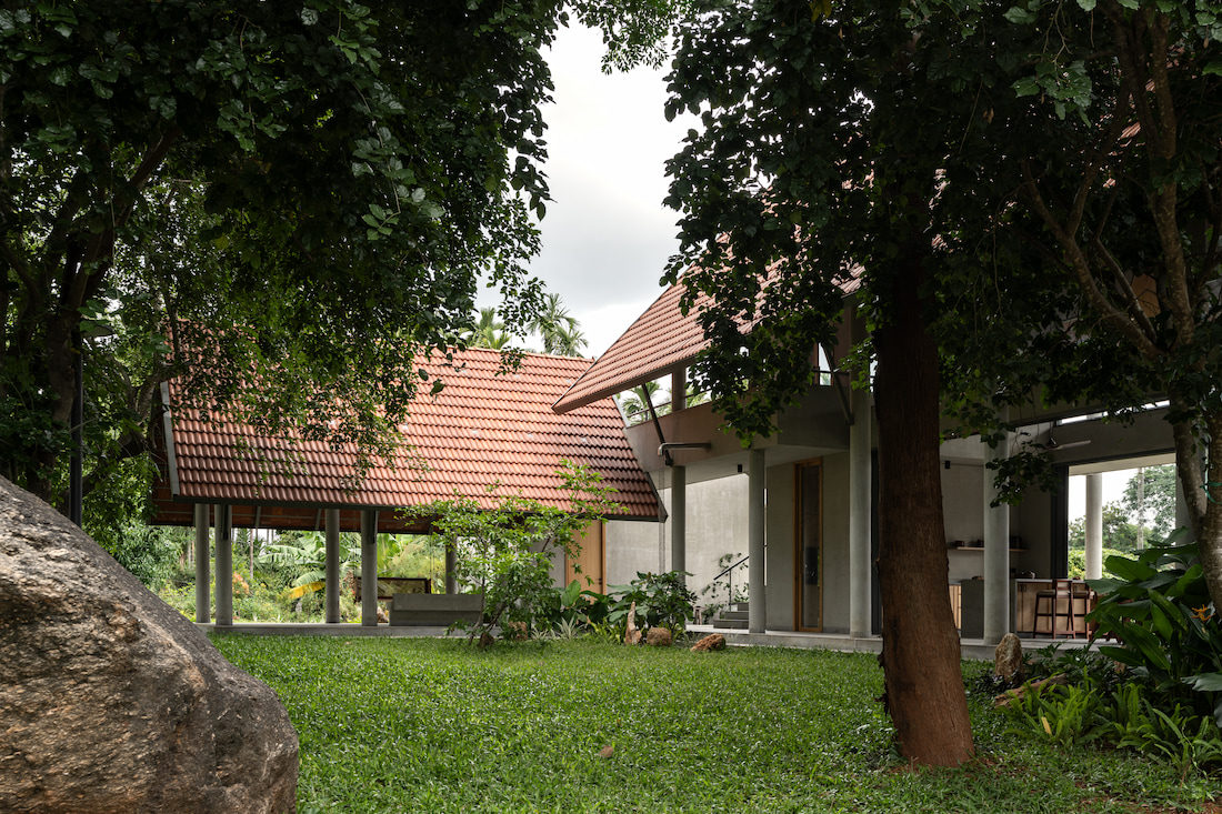 Open-plan living, dining, and kitchen spaces form the heart of the home beneath a steeply pitched Mangalore-tiled roof, while private rooms are tucked into quieter zones for retreat and intimacy. Columns choreograph light and shadow throughout the day, punctuated by pause points such as bay windows that invite reflection. Open-to-sky bathrooms further blur the boundary between indoors and outdoors, welcoming rain, breeze, and daylight into everyday rituals.