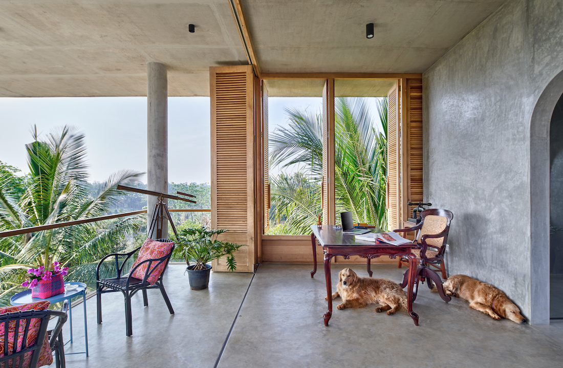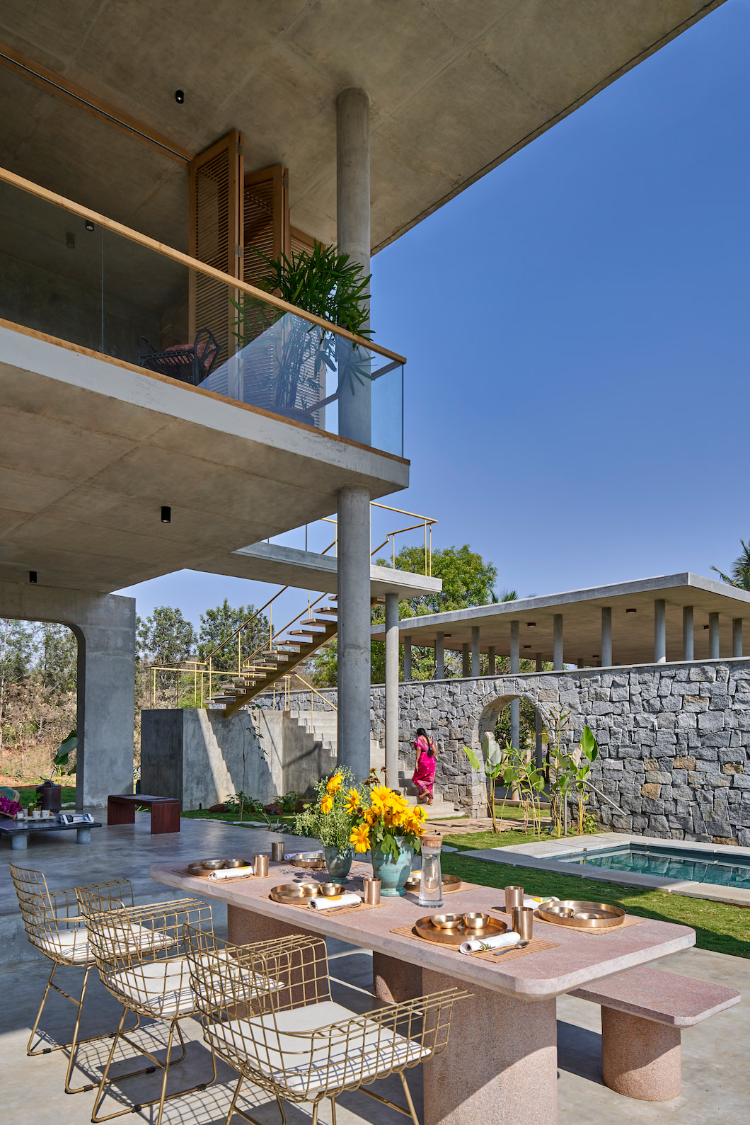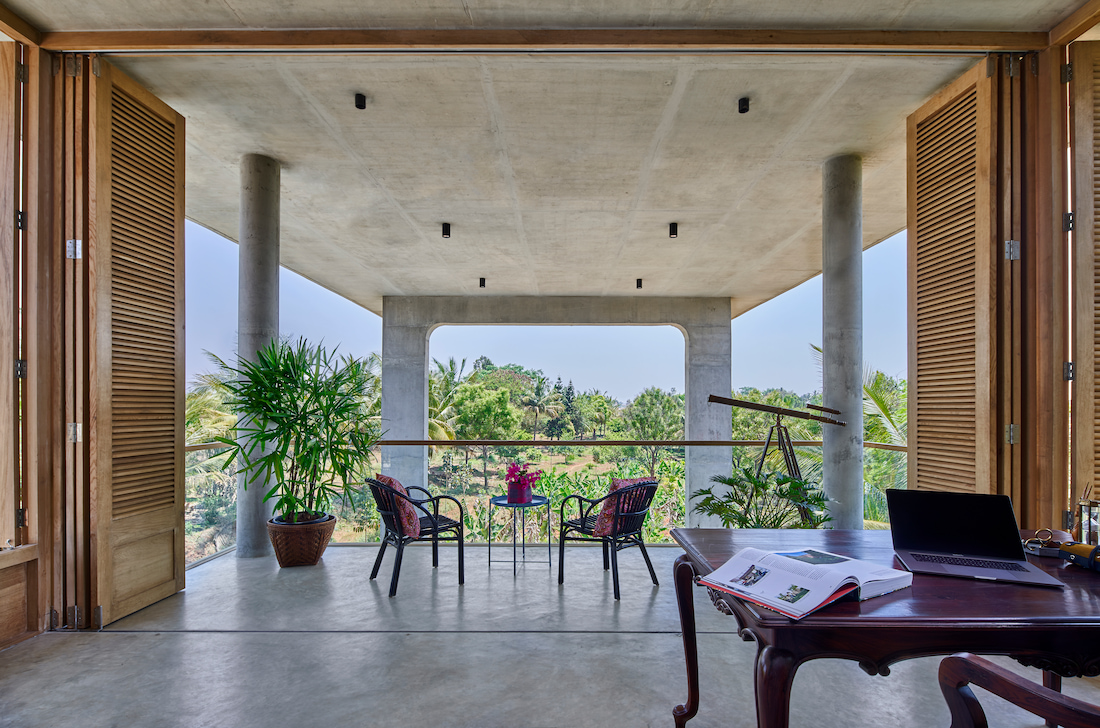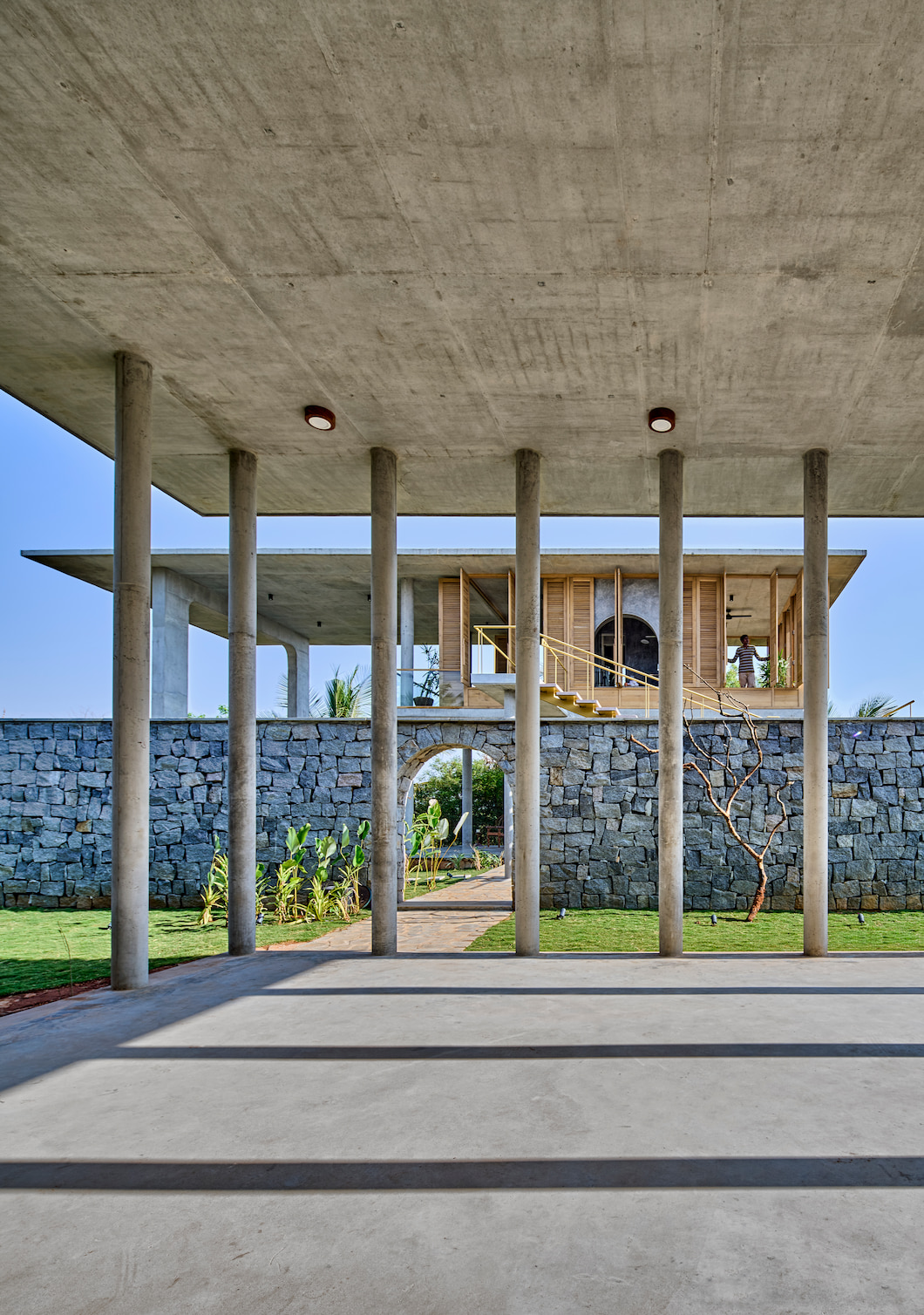 The two-storeyed residence is perched at the highest point of the site, conceived as an interplay of volumes and voids. Communal spaces on the ground floor—living, dining, and sit-out—are entwined with the landscape, while private spaces occupy the upper level, wrapped in louvered wooden screens that modulate light, air, and views. Arches, deep overhangs, and wall-free spans lend the structure a sense of lightness.