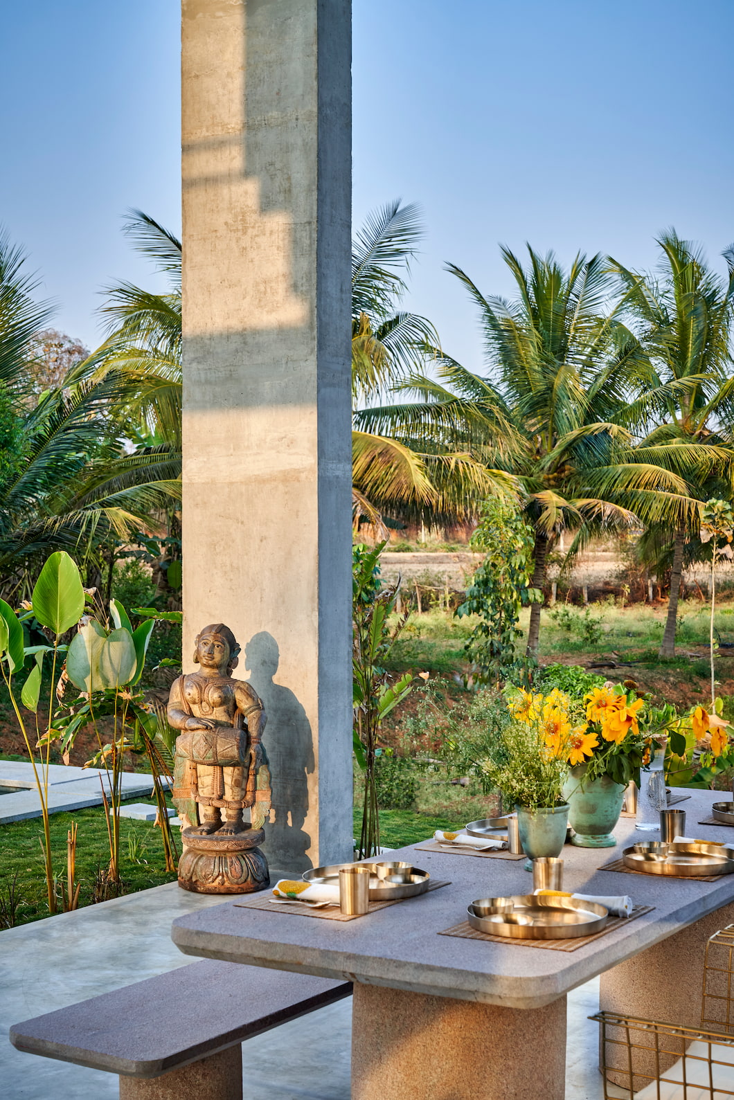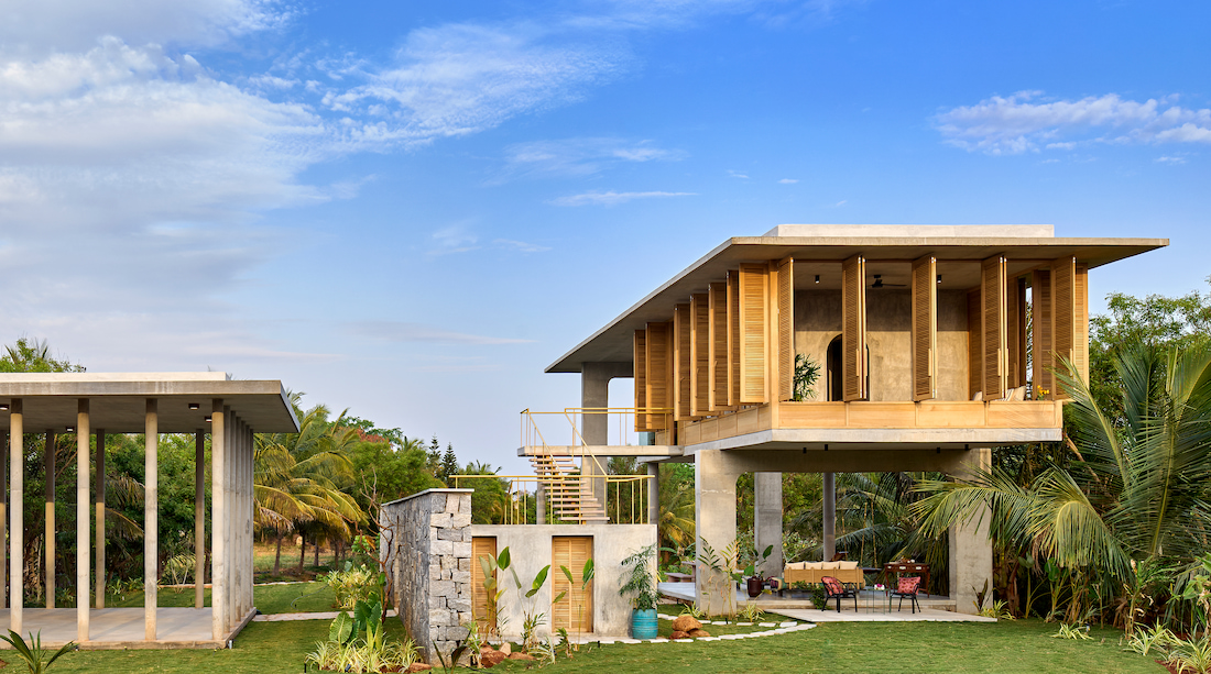 Nestled within coconut and areca plantations, with Savandurga Hill forming a dramatic backdrop, Ksaraah is a weekend retreat in rural Bengaluru that reimagines living in close communion with nature. Designed to foster a seamless connection with the outdoors, the intervention is consciously restrained—blending into its context rather than dominating it.