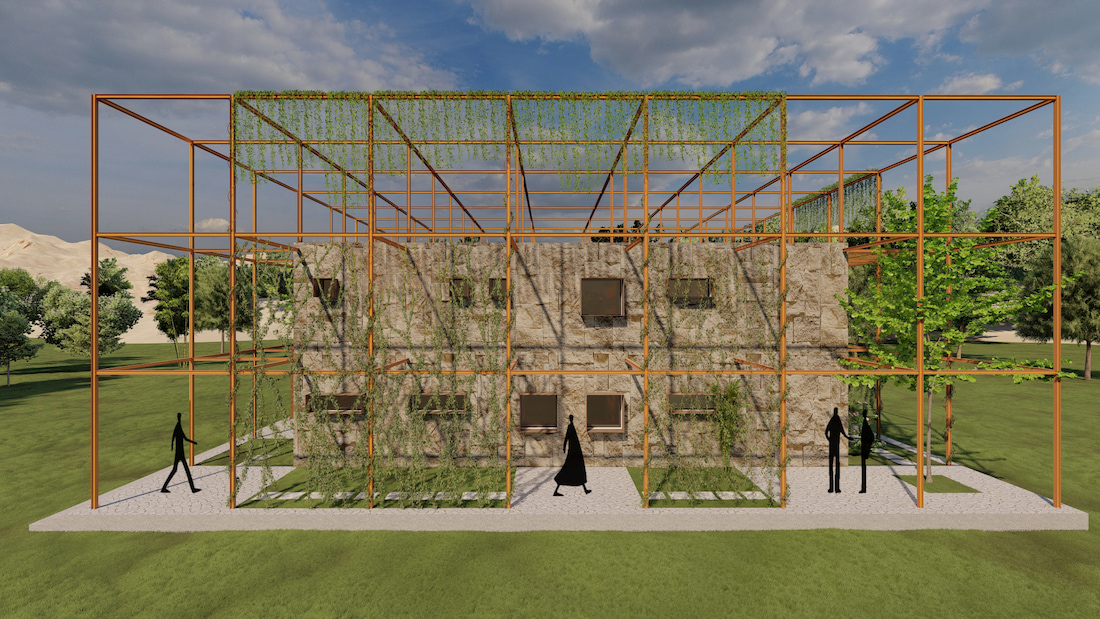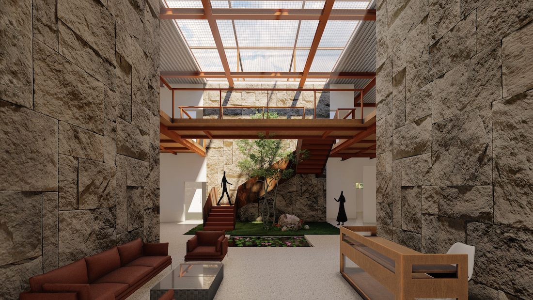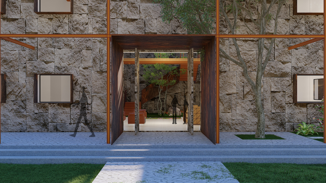 Located on the outskirts of Bellary, the upcoming NB Infrastructure Corporate Office is a climate-responsive workspace designed for a transport and infrastructure company. Inspired by the contextual architecture of Hampi, the building adopts a monolithic expression through random stone masonry façades and minimal openings, reducing heat gain while creating a strong visual identity.
