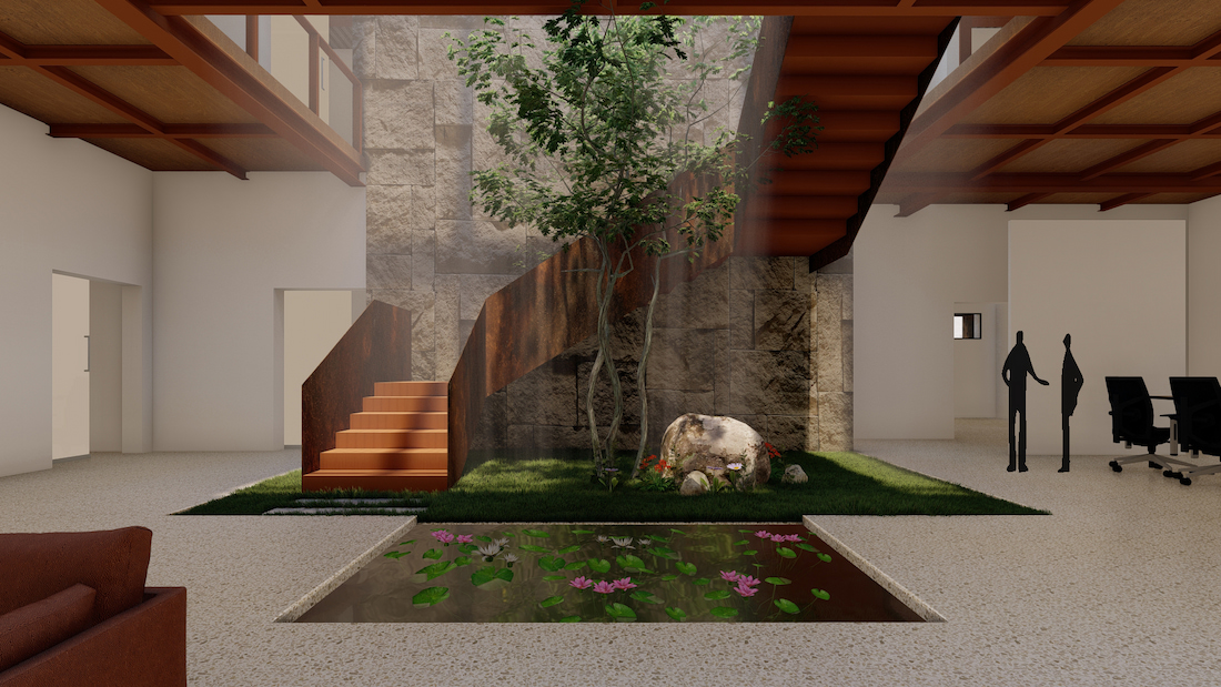 At the heart of the cubic form lies a traditional southern-style courtyard with a water pond, enhancing passive cooling and enriching the workplace ambience. Rooted in place and climate, the office emerges as a contemporary workspace that respectfully responds to its local context