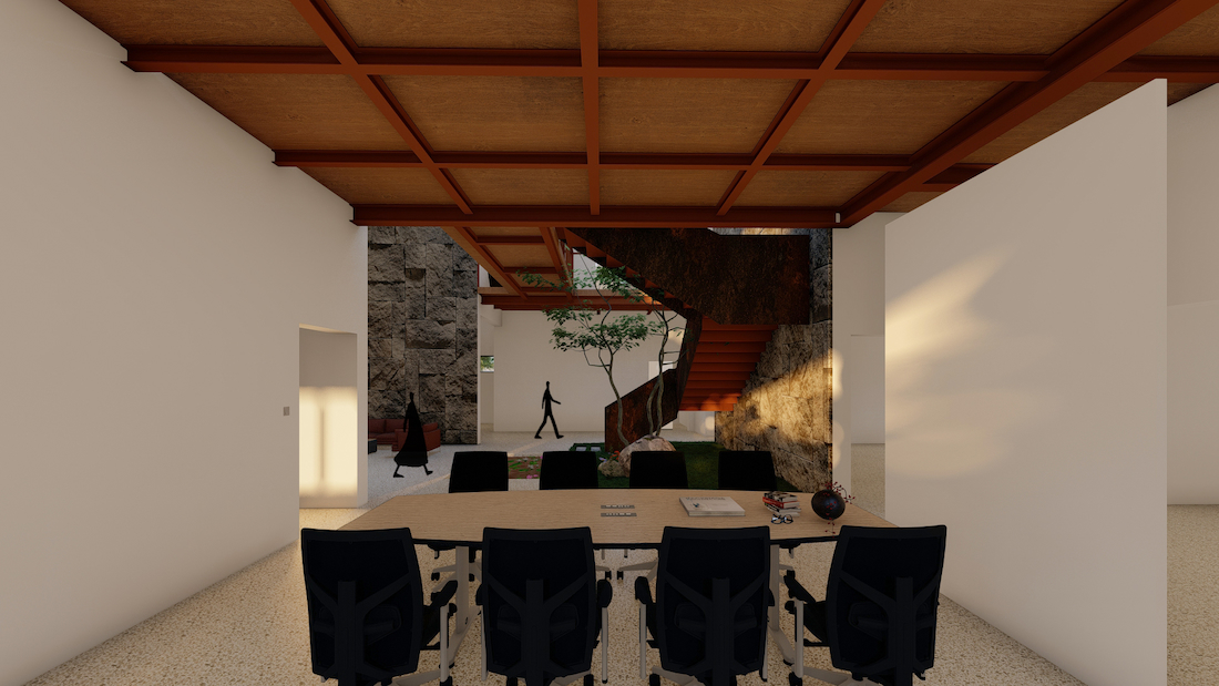 Massive stone walls layered with tropical creepers shield the structure from heat and dust, ensuring thermal comfort within. Locally quarried stone cladding lends the building an authentic, grounded character that blends seamlessly with the surrounding landscape. The ground floor accommodates office spaces, reception, and a waiting lounge, with a sculptural staircase acting as the spatial focal point. Management cabins and conference rooms occupy the first floor, organised around a central courtyard.