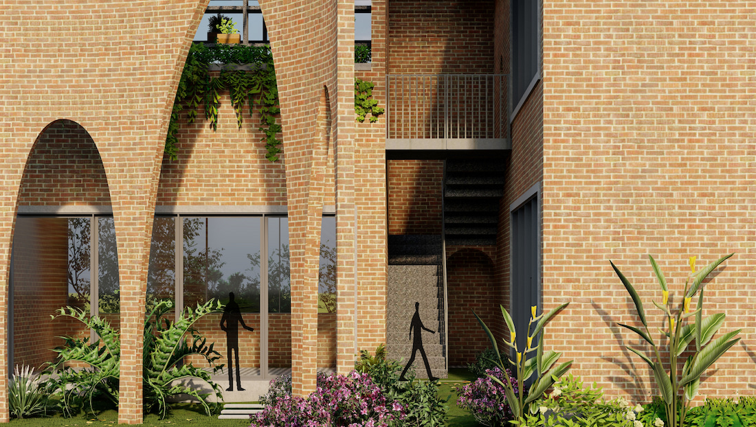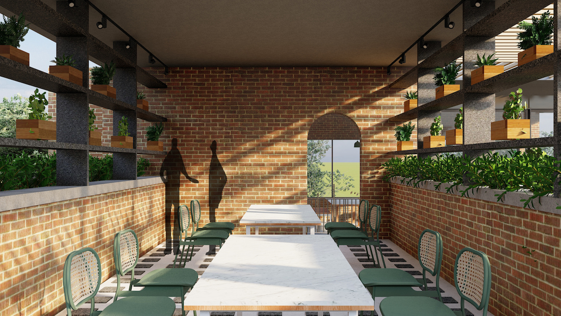 Strategically placed openings and the inherent porosity of exposed brickwork enable passive cooling, while extended roof planes and a pergola cast dynamic patterns of light and shadow. Terrazzo, cement, and wooden flooring demarcate zones across levels, complemented by indoor green pockets that soften the built environment. An exposed spiral staircase anchors the interior, reinforcing the café’s raw, tactile aesthetic.