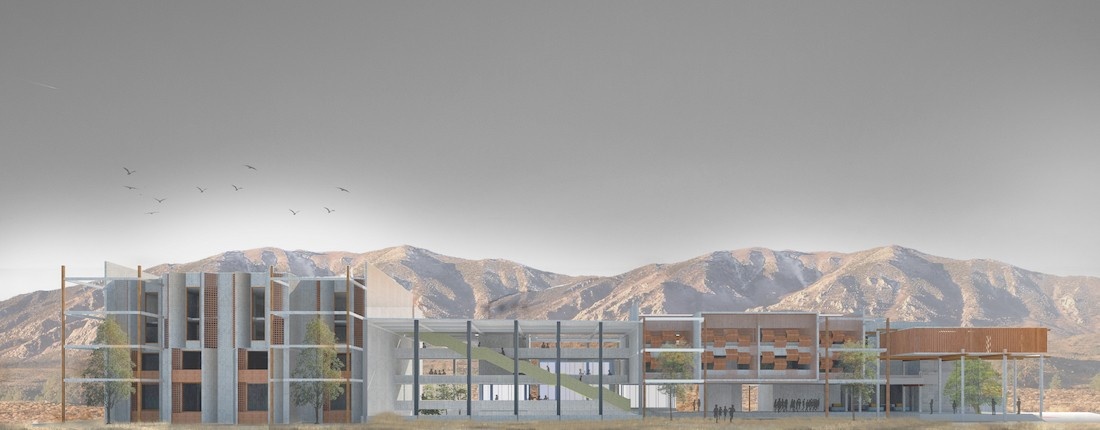 The master plan is organized as clusters of classrooms arranged around individual courtyards and aligned along a central circulation spine. This linear corridor connects the campus end to end, becoming the nucle us of movement, interaction, and communication. To address harsh weather, solar shading guided the design, with major building volumes raised on structural stilts to create shaded zones below for outdoor learning and extracurricular activities.
