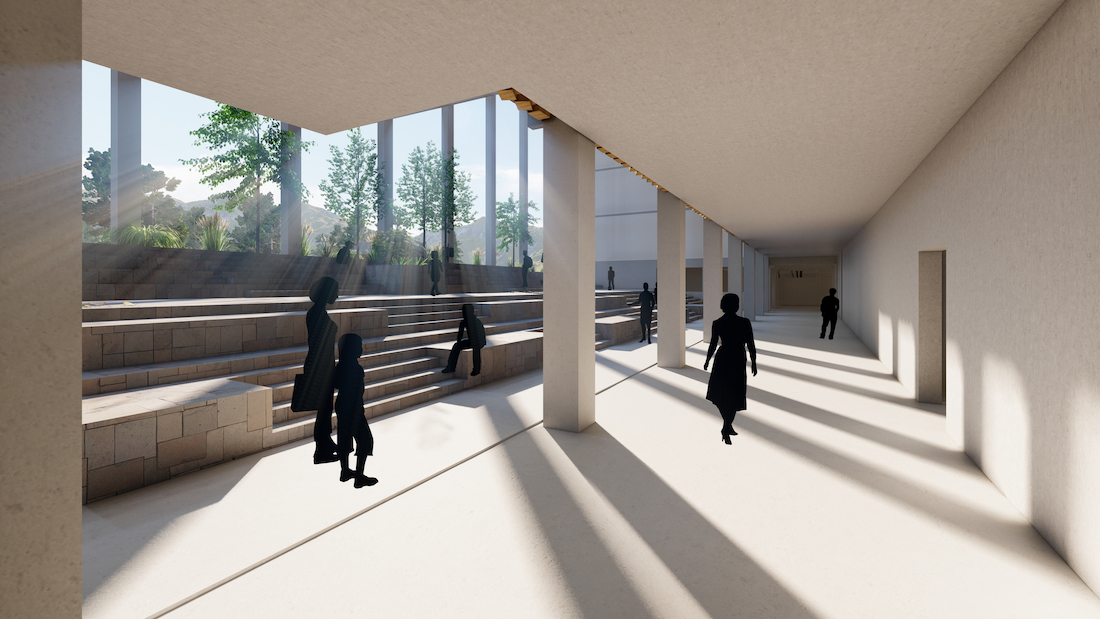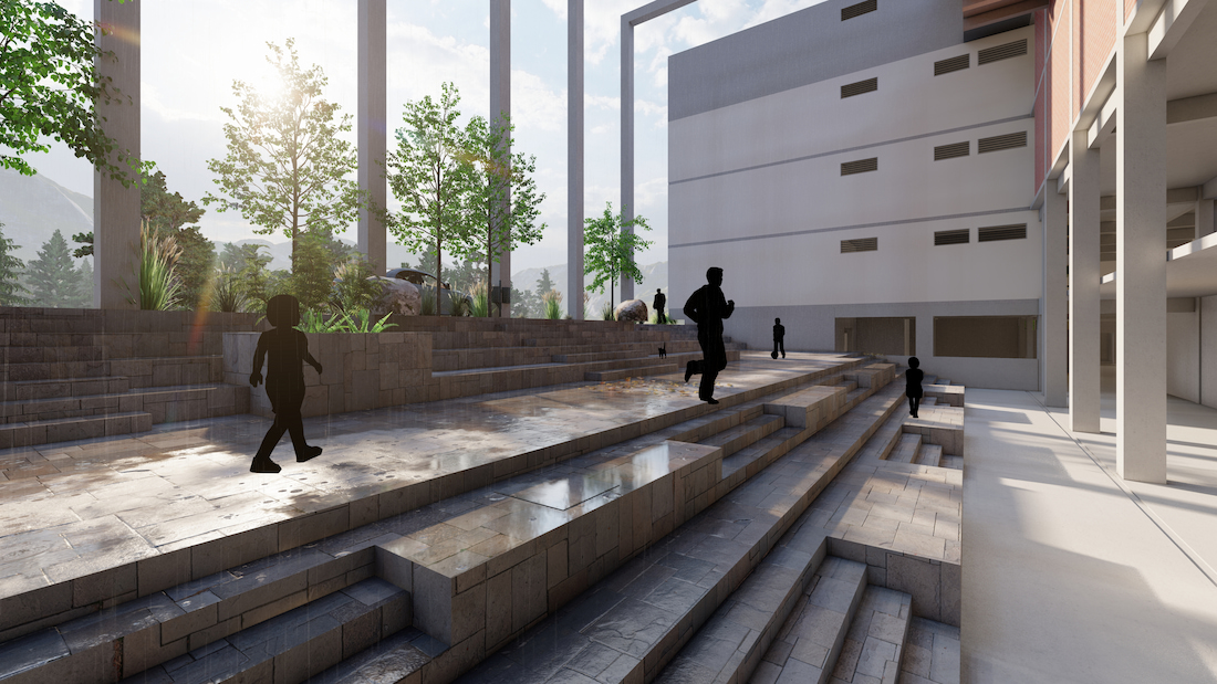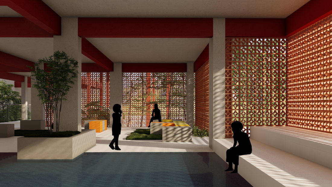 The staircase forms the architectural and social spine of the school, unifying levels while doubling as a shared gathering space. The use of adobe bricks, terracotta screens, and upcycled wood enhances thermal comfort and reduces the building’s carbon footprint—resulting in a climate-responsive, sustainable learning environment rooted in its context.