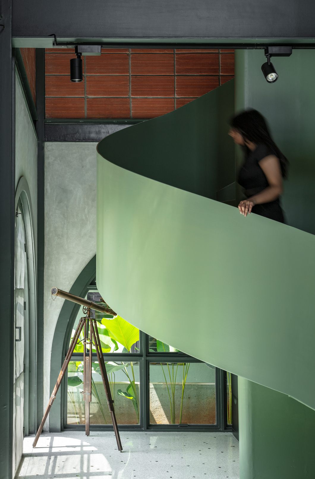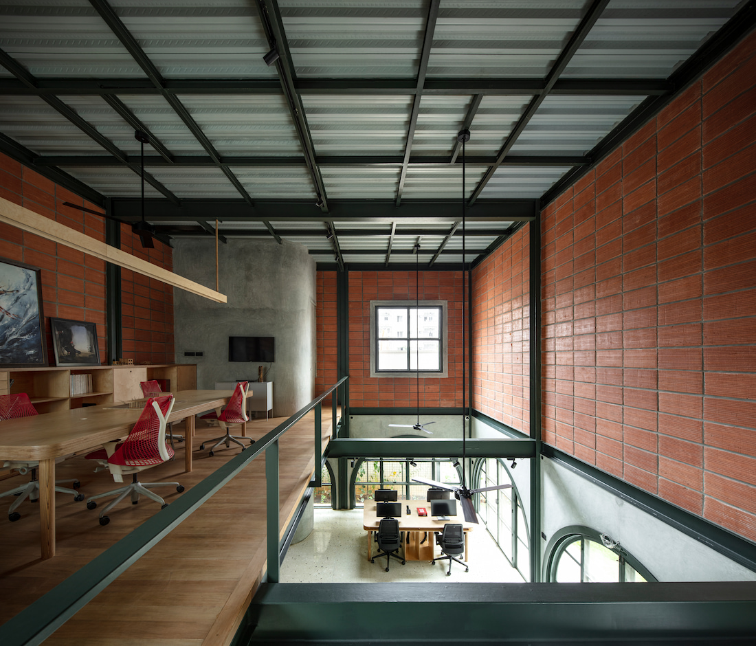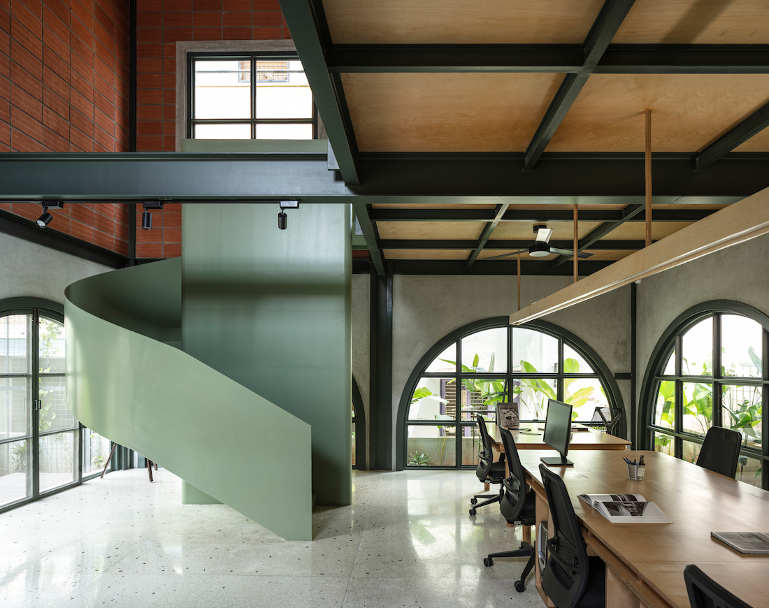 Internally, staggered volumes enhance visual connectivity across levels, reinforcing collaborative learning. A double-height workspace, mezzanine discussion are a, and a sculptural sage-green metal staircase form the spatial core. The upper level houses private work and meeting areas without complete separation, maintaining visual dialogue throughout. Sustainable choices—including recycled terrazzo flooring, on-site crafted furniture, and rooftop solar panels—underscore the studio’s commitment to responsible design