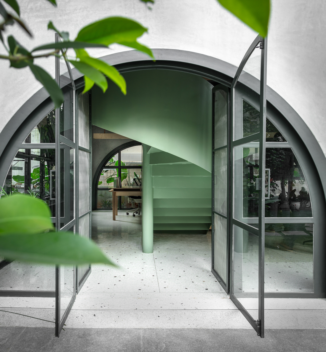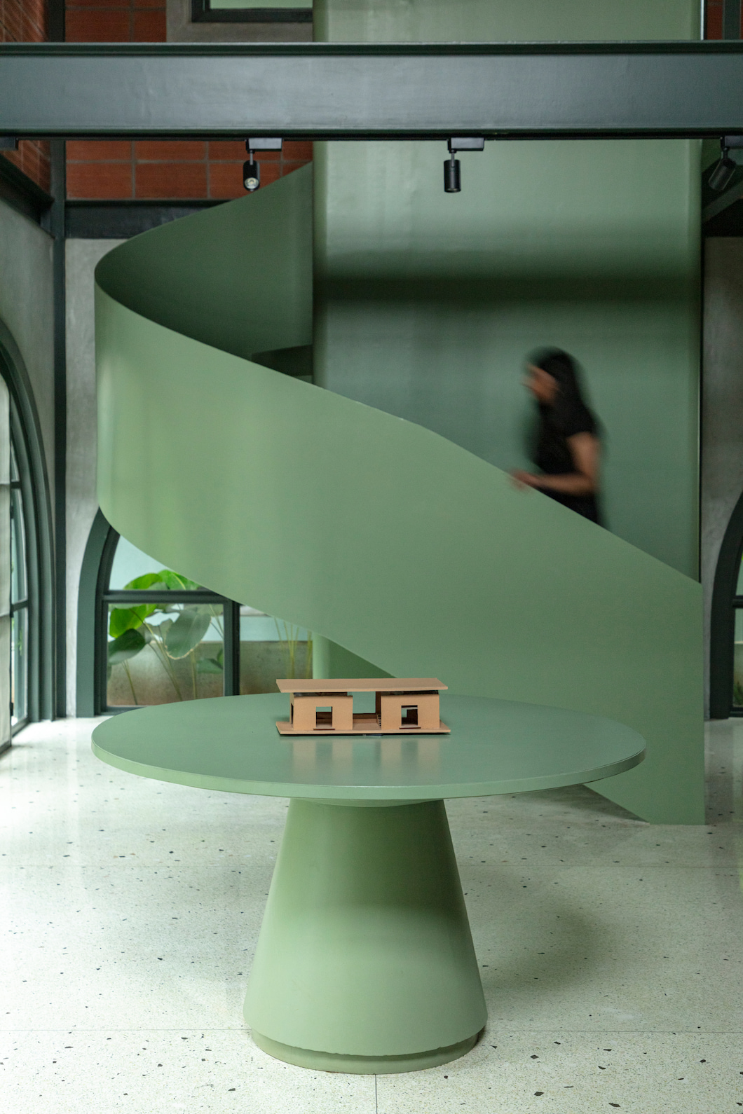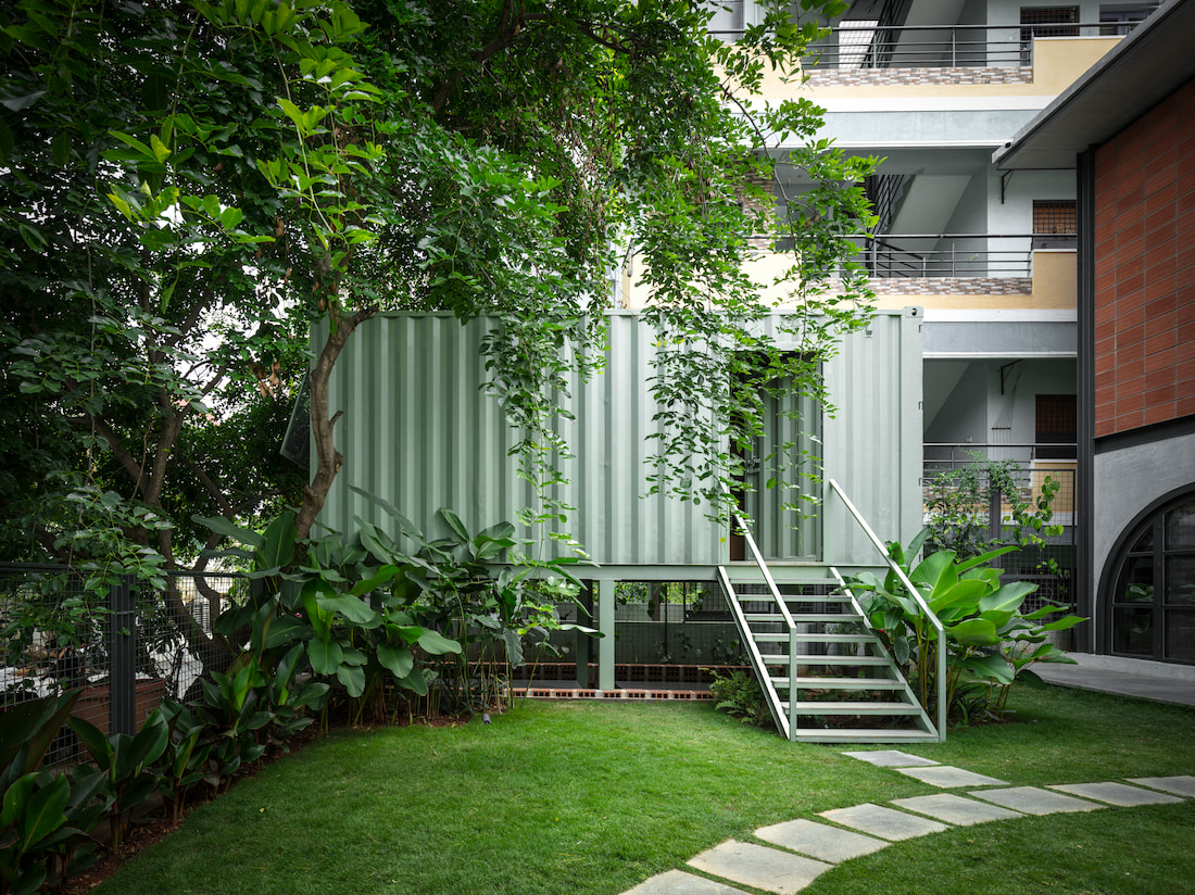 Internally, staggered volumes enhance visual connectivity across levels, reinforcing collaborative learning. A double-height workspace, mezzanine discussion are a, and a sculptural sage-green metal staircase form the spatial core. The upper level houses private work and meeting areas without complete separation, maintaining visual dialogue throughout. Sustainable choices—including recycled terrazzo flooring, on-site crafted furniture, and rooftop solar panels—underscore the studio’s commitment to responsible design